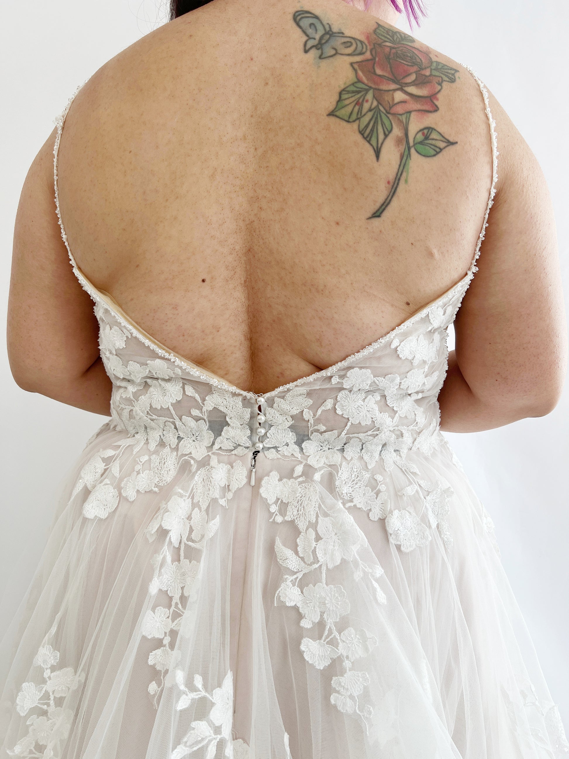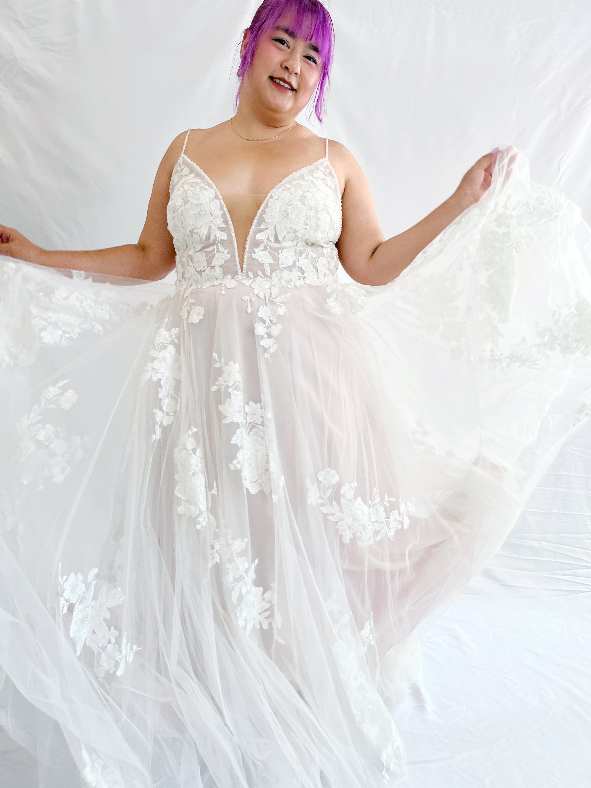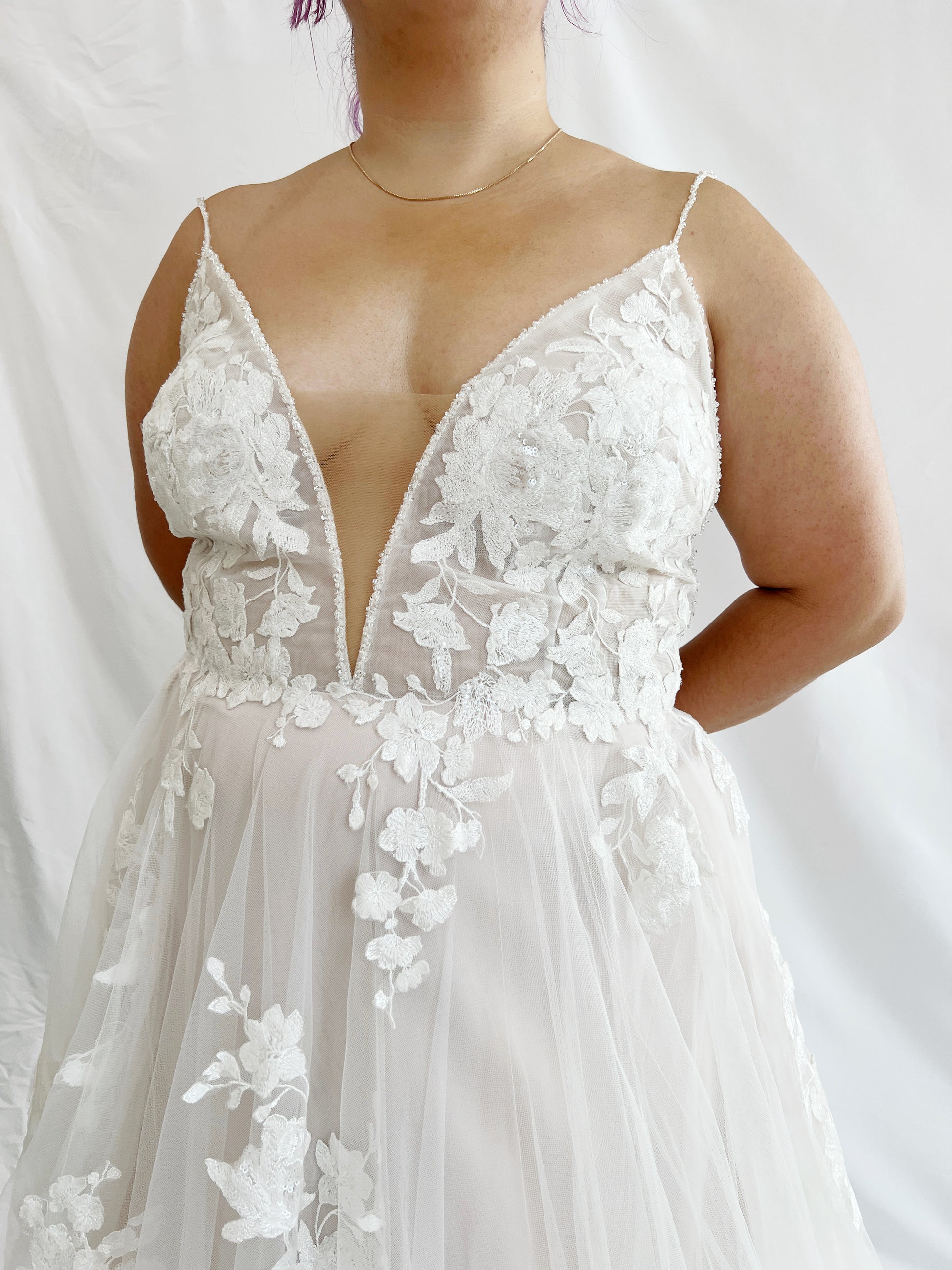 Capture the essence of spring with our stunning floral A-line gown, the Joelle Wedding dress. Its plunging V-neckline embellished with delicate beadwork brings a touch of glamour to this enchanting and romantic silhouette.