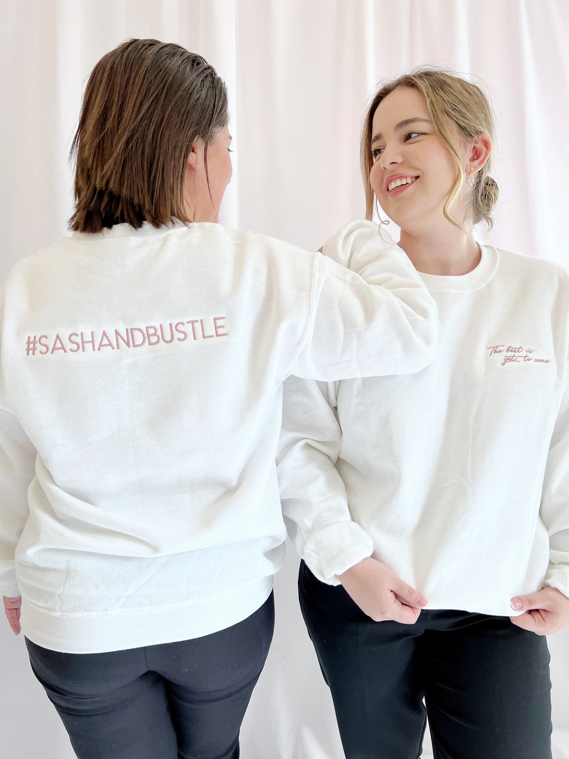 Get your cozy on! In these adorable #SashAndBustle branded crew neck sweaters; because the best is yet to come!